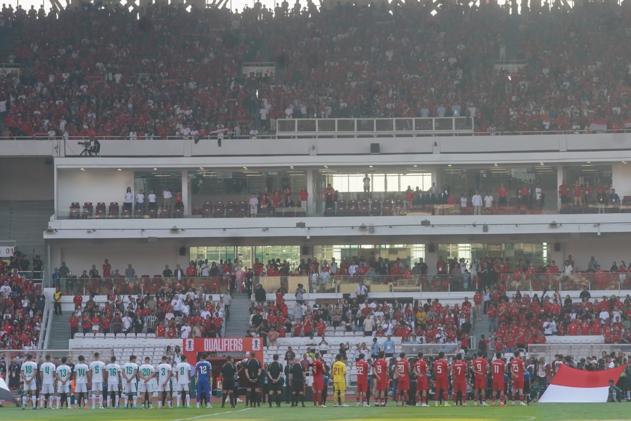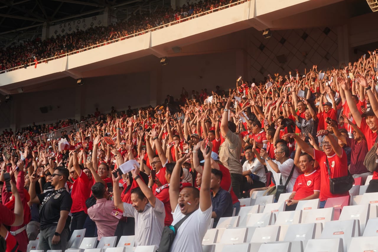 Presiden Jokowi dan Menpora Dito tampak menikmati pertandingan. Rombongan antusias menyaksikan perjuangan Marselino Ferdinan dan kawan-kawan. Saat jeda laga, Presiden terlihat menyapa penonton.