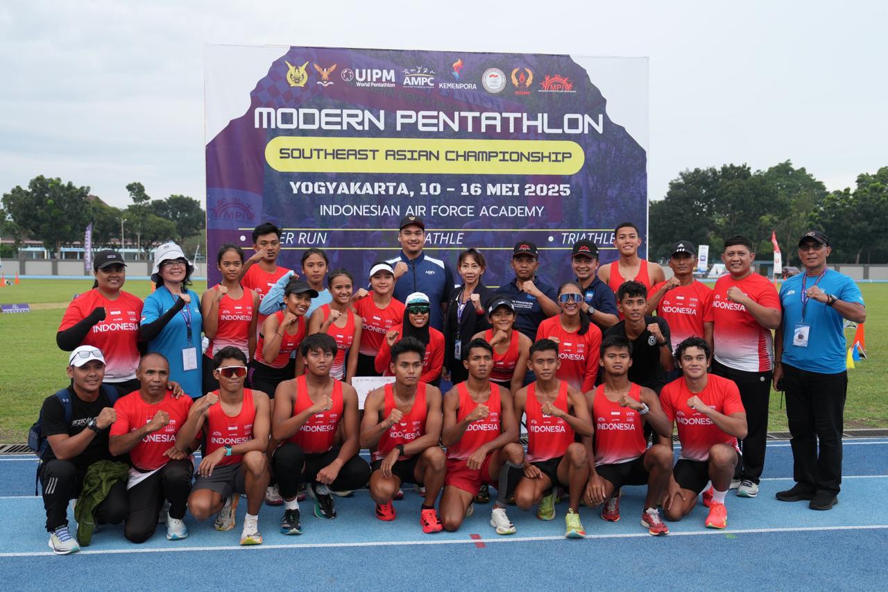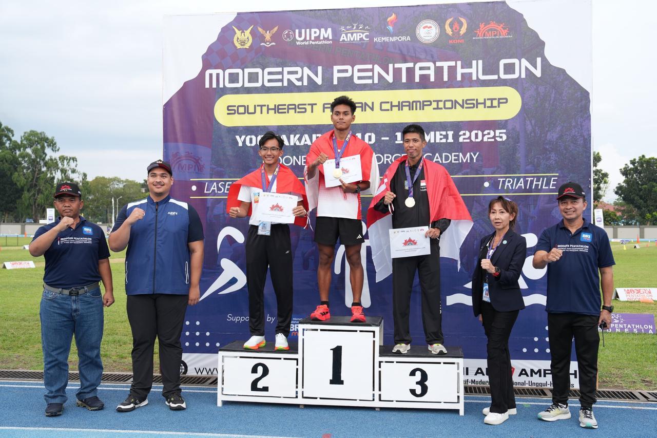 Menteri Pemuda dan Olahraga Republik Indonesia (Menpora RI) Dito Ariotedjo mengalungkan medali emas kepada Graha Rizky dan Dea Salsabila Putri di ajang Modern Pentathlon Southeast Asia (MPSEA) Championship 2025 di Akademi Angkatan Udara, Yogyakarta, Senin (12/5).