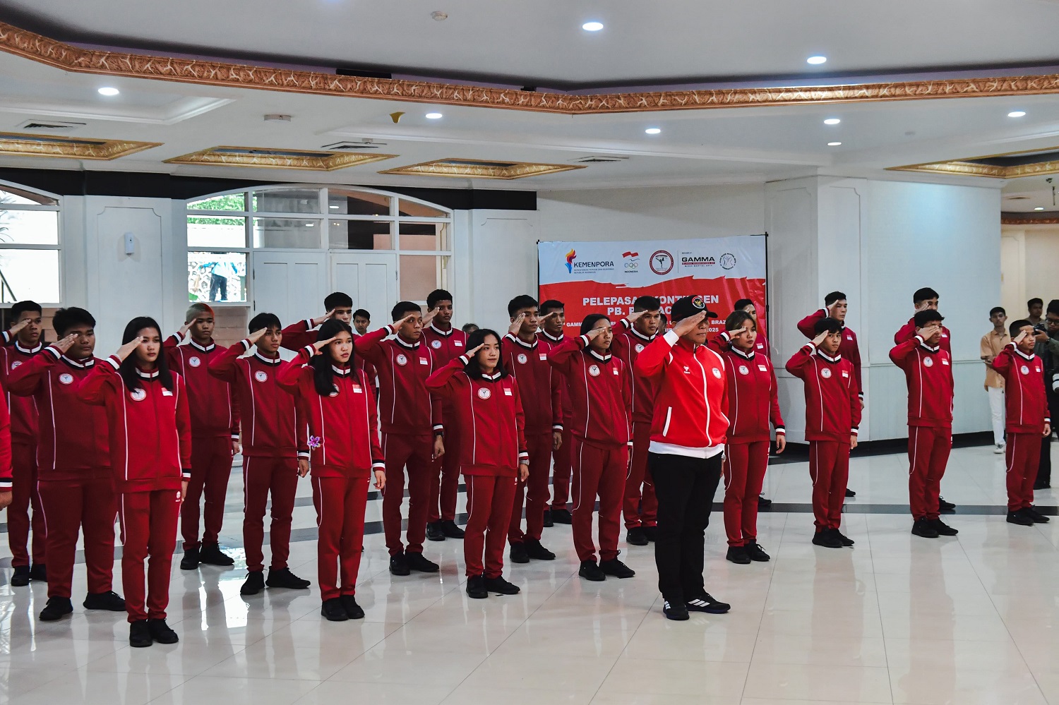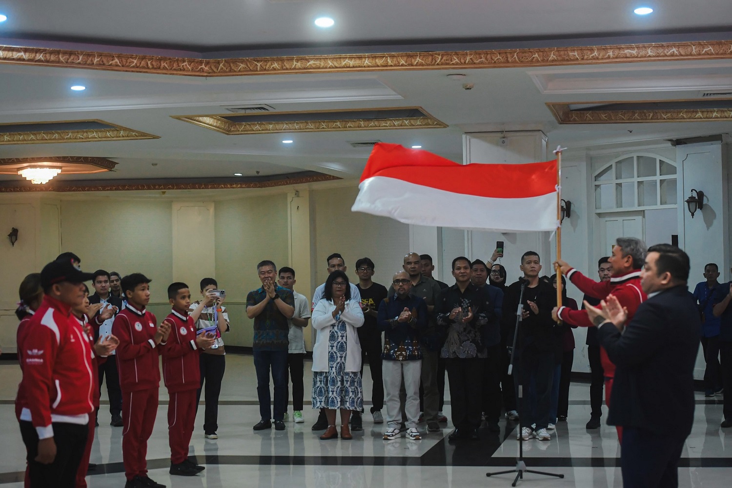 Dalam seremoni pelepasan, Menpora Dito secara simbolis menyerahkan bendera Merah Putih kepada manajer tim sebagai tanda kepercayaan dan kehormatan negara kepada para atlet yang akan bertanding mewakili Indonesia.