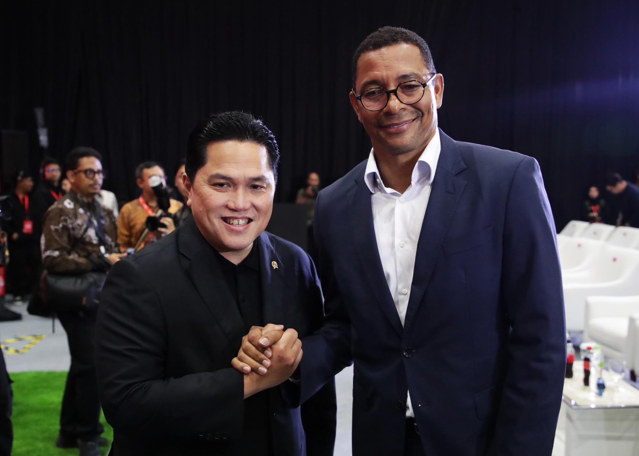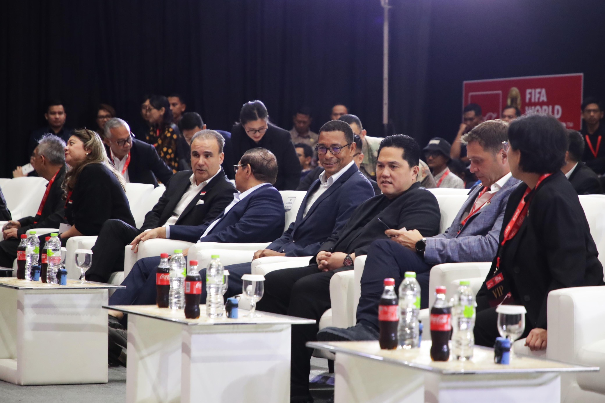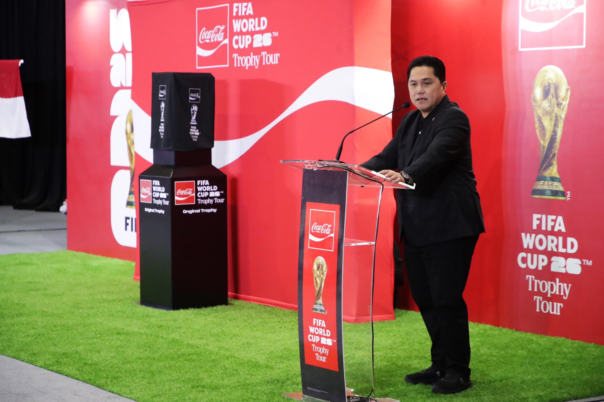 Menteri Pemuda dan Olahraga Republik Indonesia (Menpora RI), Erick Thohir, menghadiri FIFA World Cup 2026 Trophy Tour di Jakarta Convention Cenyer (JCC), Jakarta, Kamis (22/1). Kehadiran trofi Piala Dunia di Tanah Air menjadi bukti nyata komitmen serius FIFA dalam mendukung sepak bola Indonesia dan pengakuan terhadap potensi olahraga tanah air.